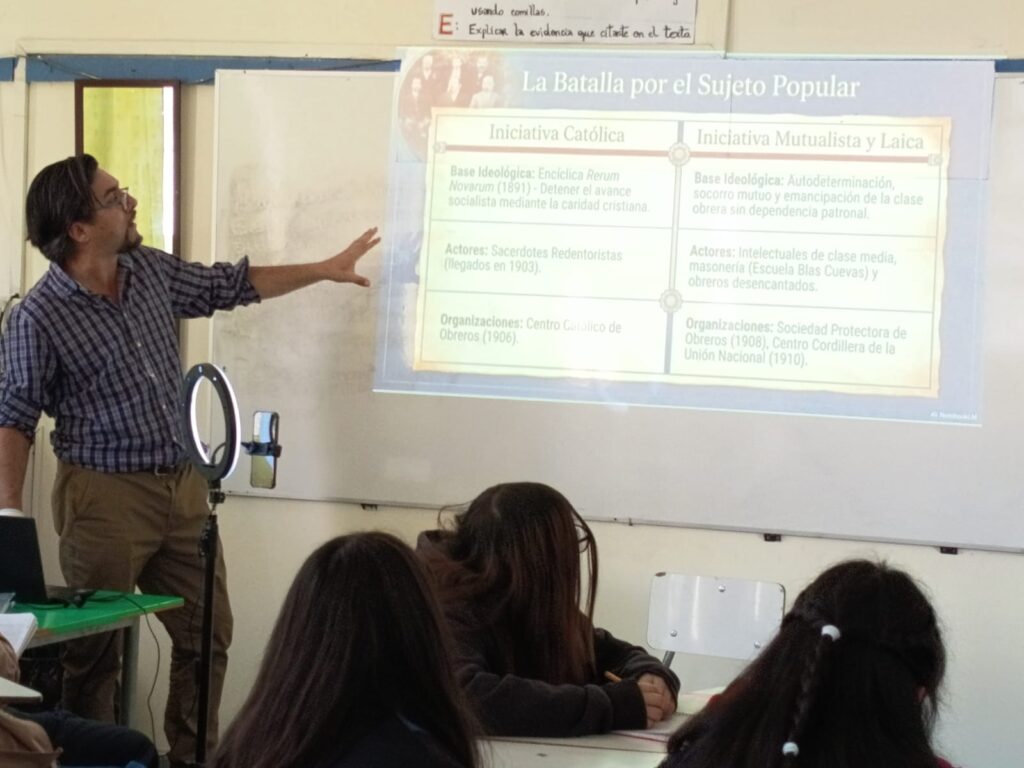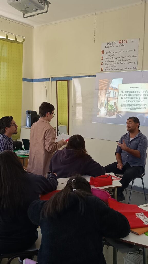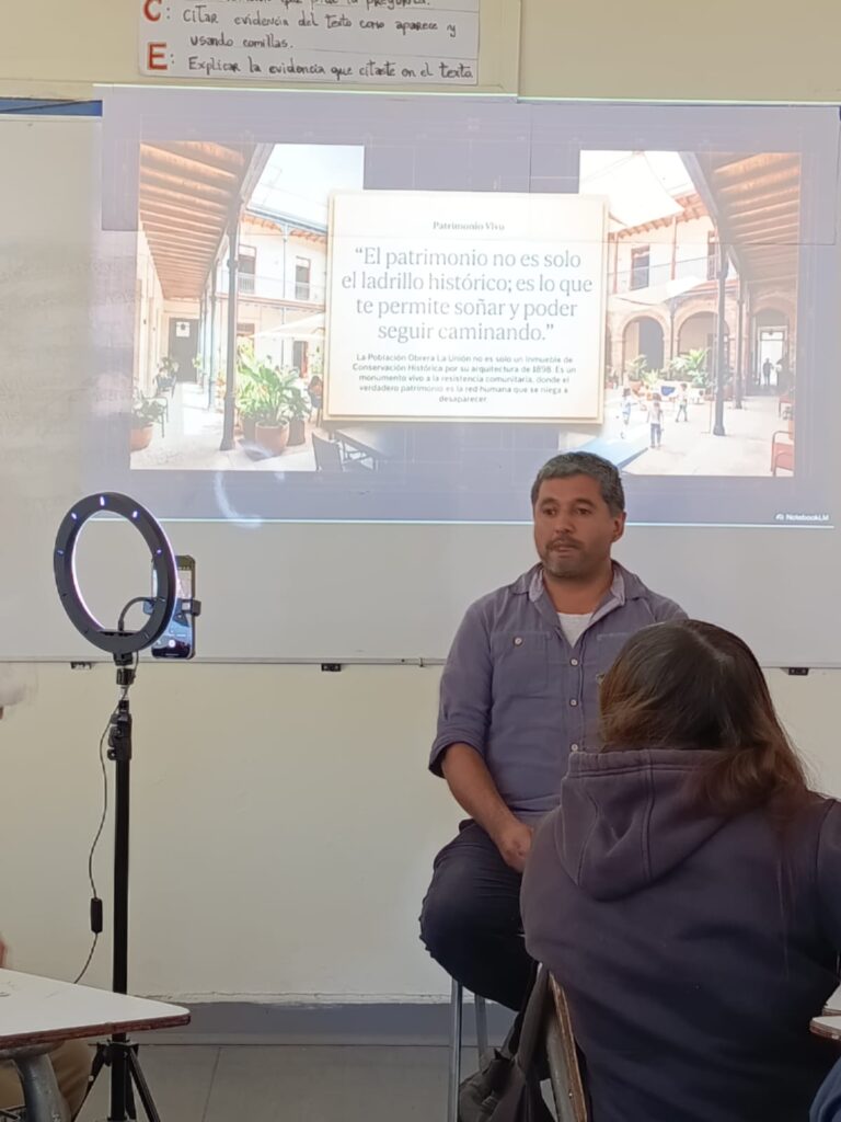 En su calidad de vecino de la Población Obrera de la Unión fue invitado el encargado del área de Infraestructura del Espacio Comunitario Santa Ana, Christian Amarales por estudiantes del séptimo básico, quienes publicarán un podcast con las consultas.
