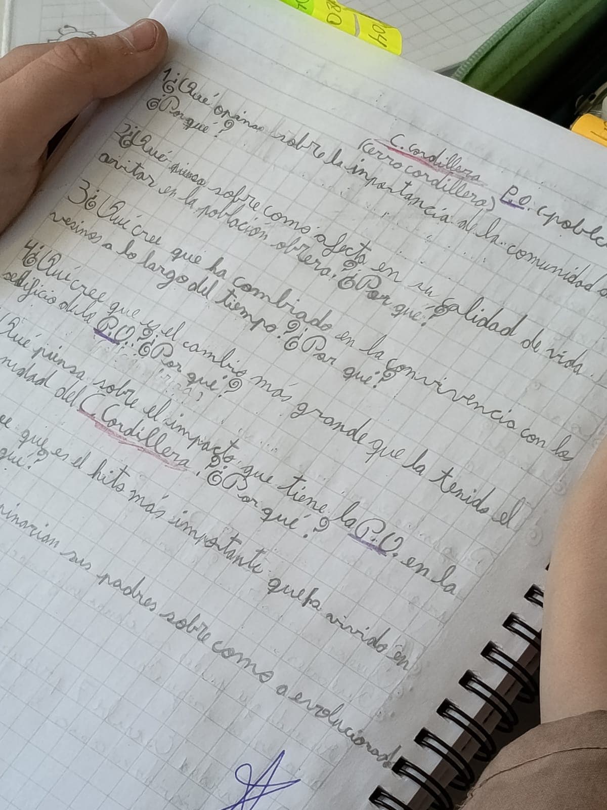 Cada estudiante hizo una pregunta al dirigente social del cerro Cordillera sobre la historia, valor local, estilo de vida en comunidad y futuro de la Población Obrera. Especial interés concitó la remodelación integral del antiguo edificio el año 2008, por ser gestionada por los propios habitantes.